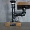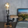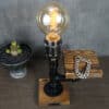 - Material: metal pipes, aluminum lamp head, tungsten filament Edison bulb, and solid pine wood base with a small shelf.